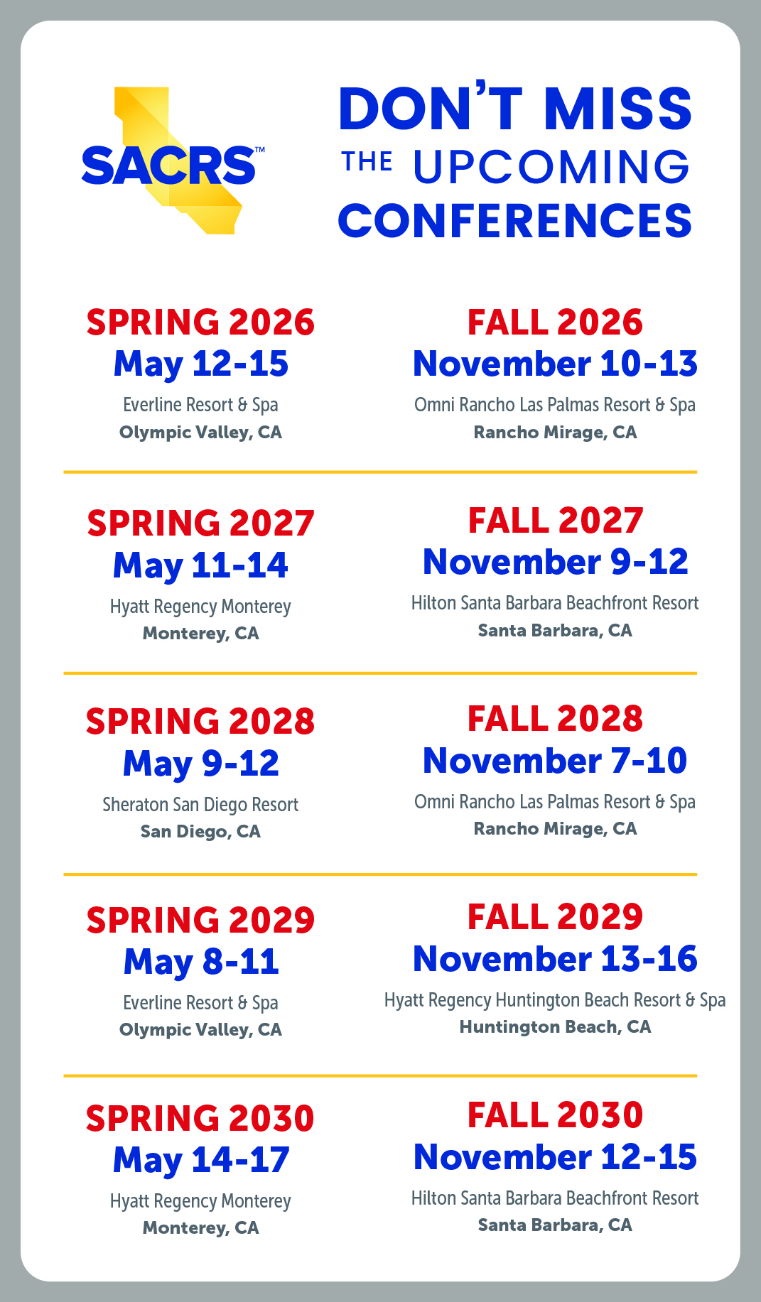 A key SACRS member benefit is education. SACRS has an outstanding reputation for creating must-attend events that include educational general sessions, breakouts, and networking opportunities. Next year the SACRS Spring Conference 2026 is being held May 12-15, 2026 at the Everline Resort & Spa in Olympic Valley, California.